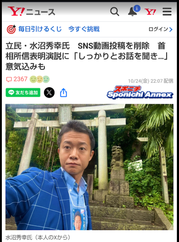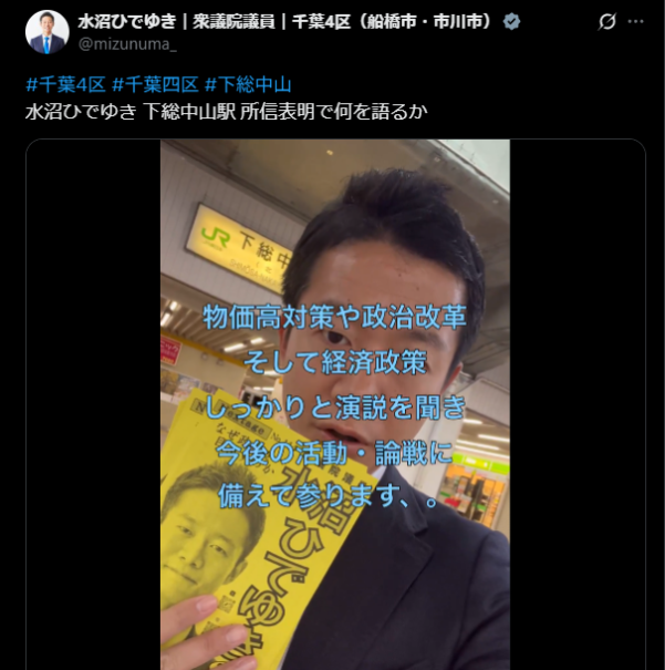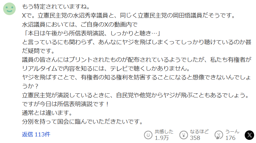 立憲民主党1年目の水沼議員は、高市総理所信表明の演説をしっかりと聞きたいとXで発信していた。