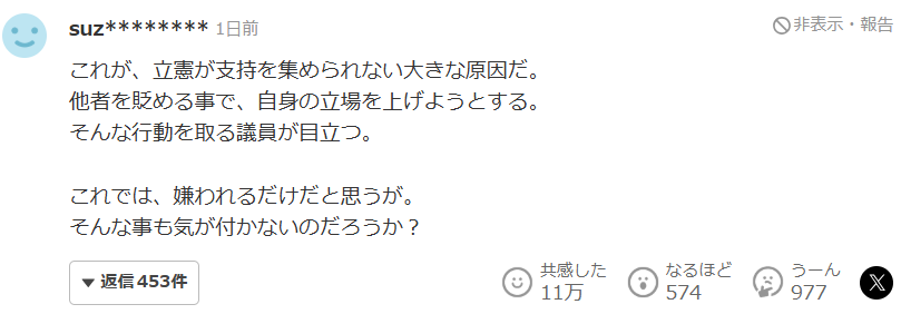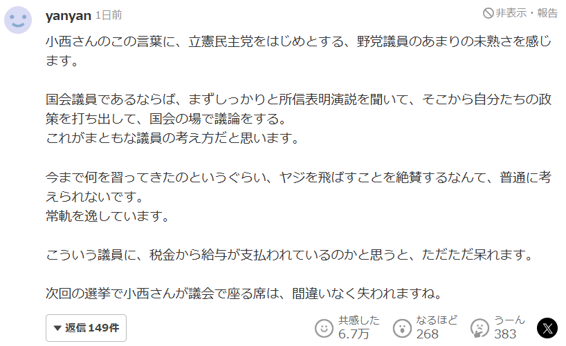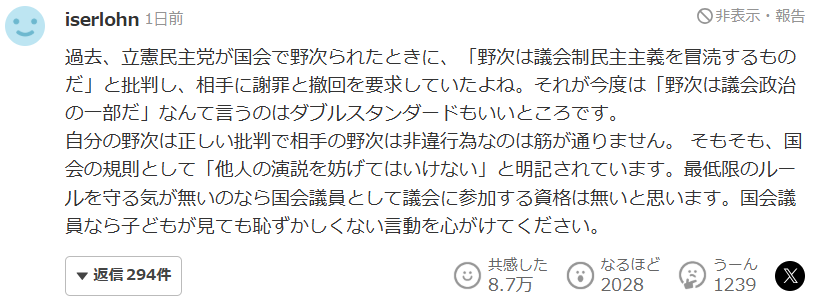 私的には、野次というより妨害なので、演説妨害の禁止を法律で決めてほしいです。根本的にやっていることは、しばき隊の「ただ連呼して妨害する」と同じだと思います。それにしても、同じ1年生議員が声を合わせたかのように率先して野次を行うものなのでしょうか?すごく疑問が残りました。