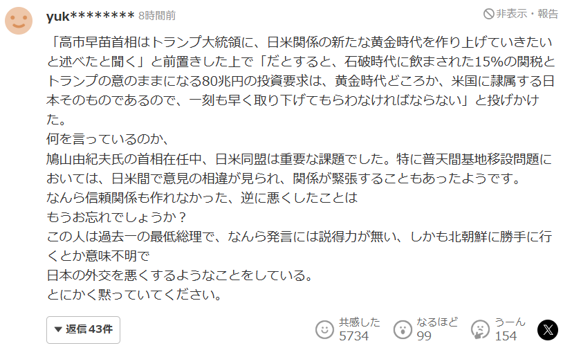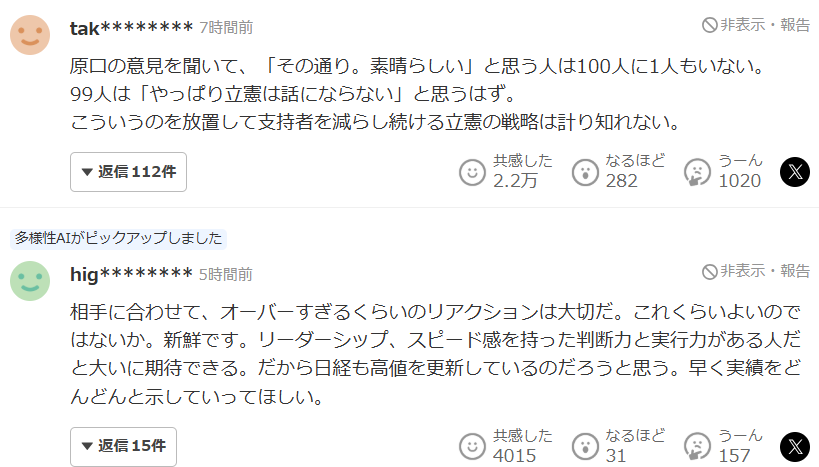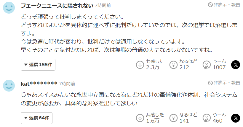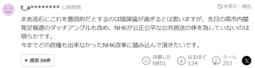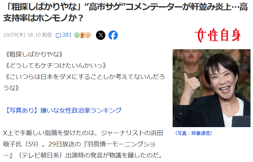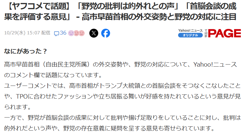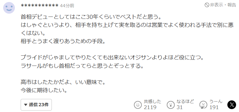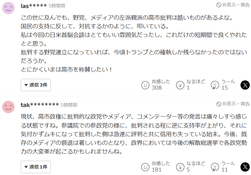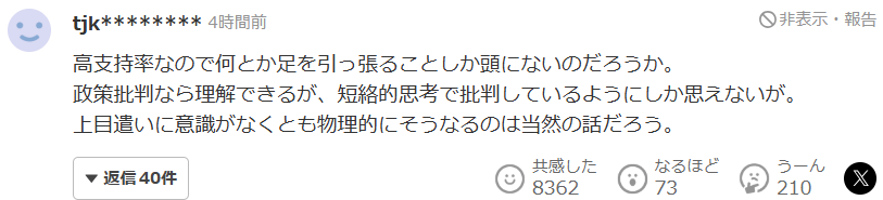 左派系メディアと左派の人たちが適当な理由をつけて、高市総理サゲをしているのだと判断しました。以下のヤフーコメントの比率でわかります。