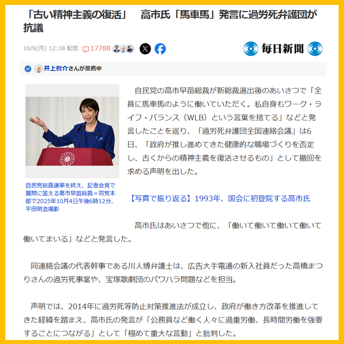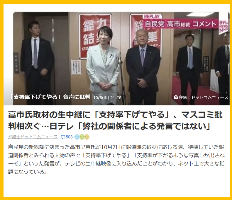 各報道メディアがこぞって高市新総裁の発言を悪いイメージに印象操作していた。悪くないことも悪い印象で報道することにより、国民感情を誘導する、という手口です。