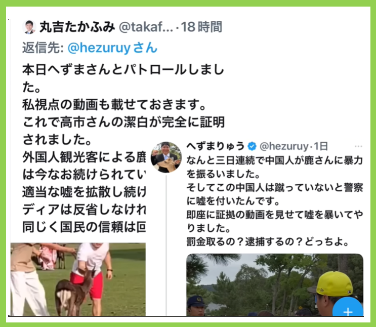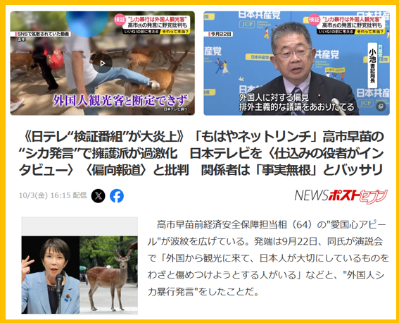 総裁選の時、高市さんのシカを蹴る外国人がいる、という発言に対して、各メディアが一斉にそのような事実は無い、という印象で報じた。